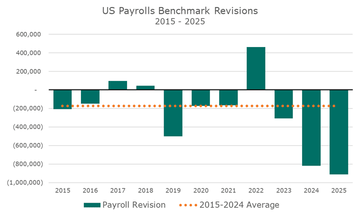In terms of magnitude, it isn’t nice at all. In the ten years ending in 2024, the average revision was -172.4k (and the terrible 2024 reading highly influenced that average). That makes the 2025 reading more than five times worse than the previous year’s average. Double wow.